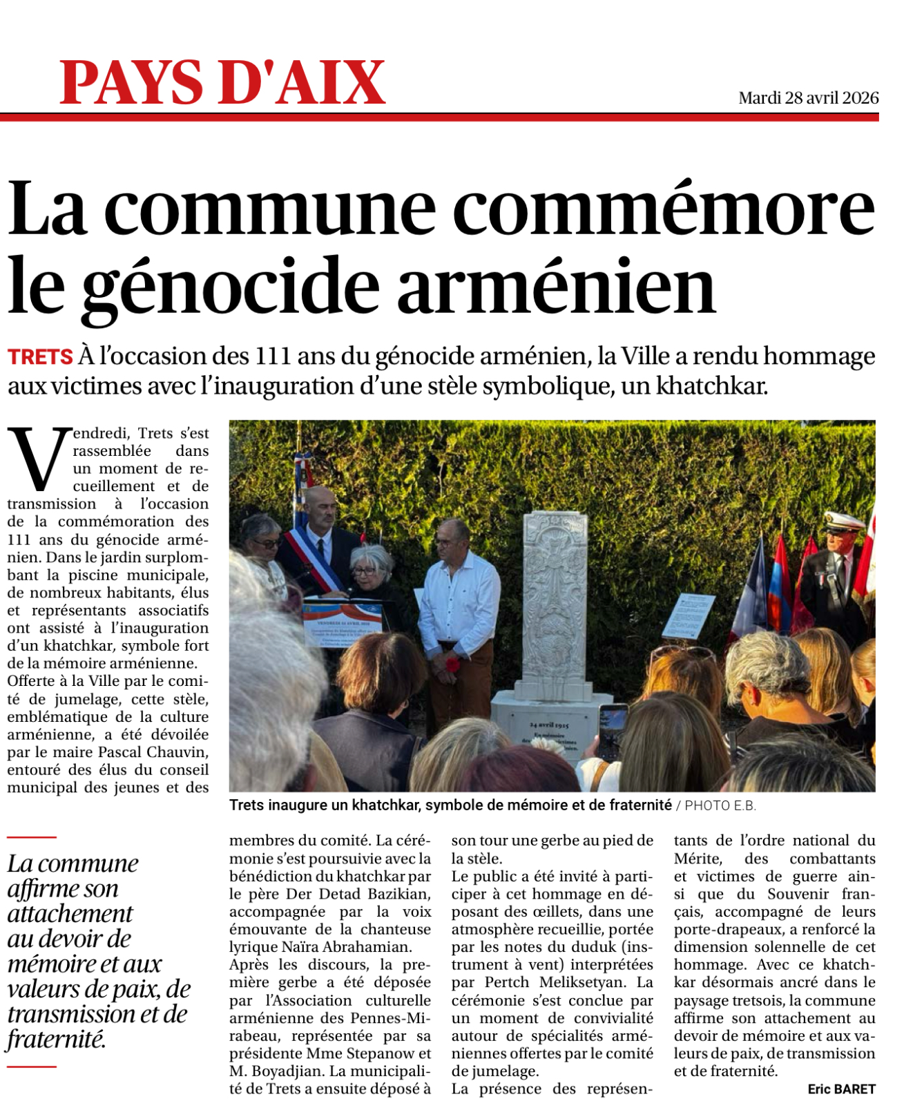 Inauguration du khatchkar et commémoration 2026 du Génocide arménien