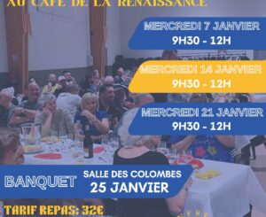 La Confrérie Saint-Éloi organise son traditionnel repas d’hiver dimanche 25 janvier 2026 à la Salle des Colombes Réservez vos places les mercredis 7, 14 et 21...