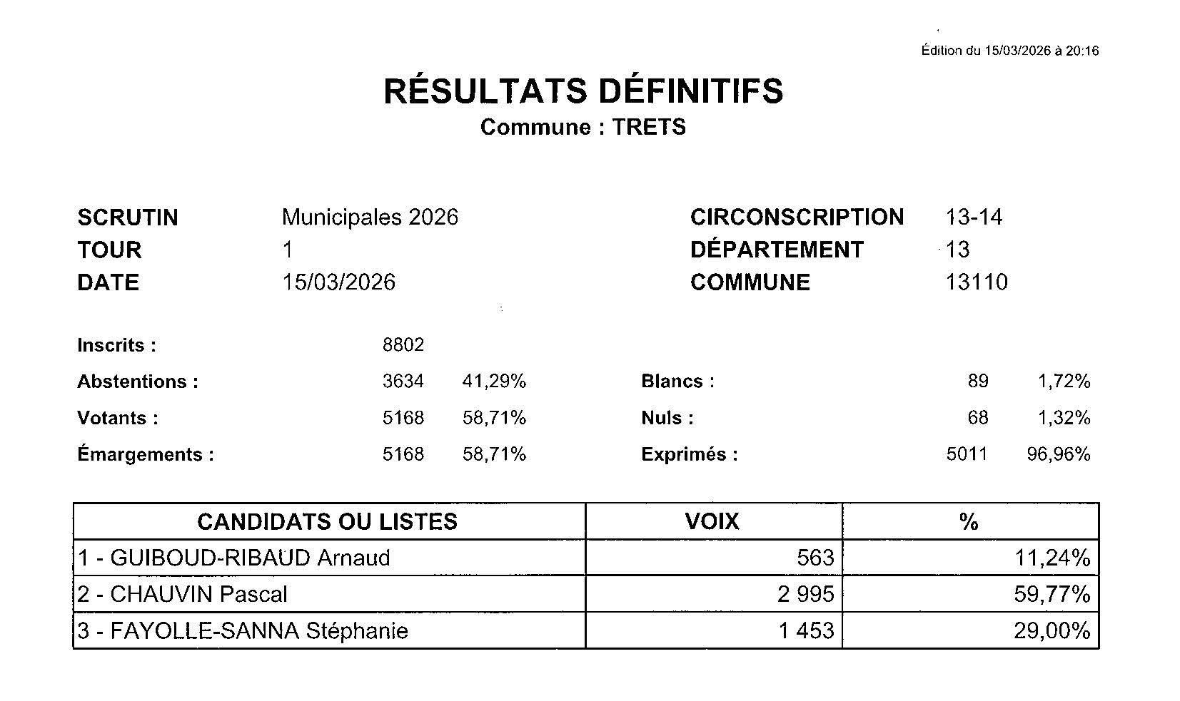 15 mars 2026 La liste « Trets nous rassemble » menée par Pascal CHAUVIN, Maire sortant, est élue au 1er tour avec 59.77% des voix.
