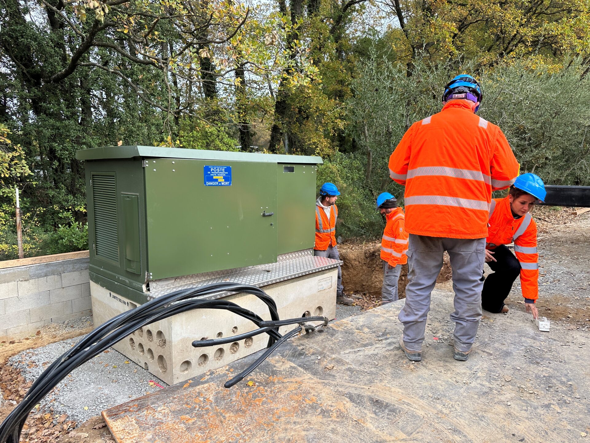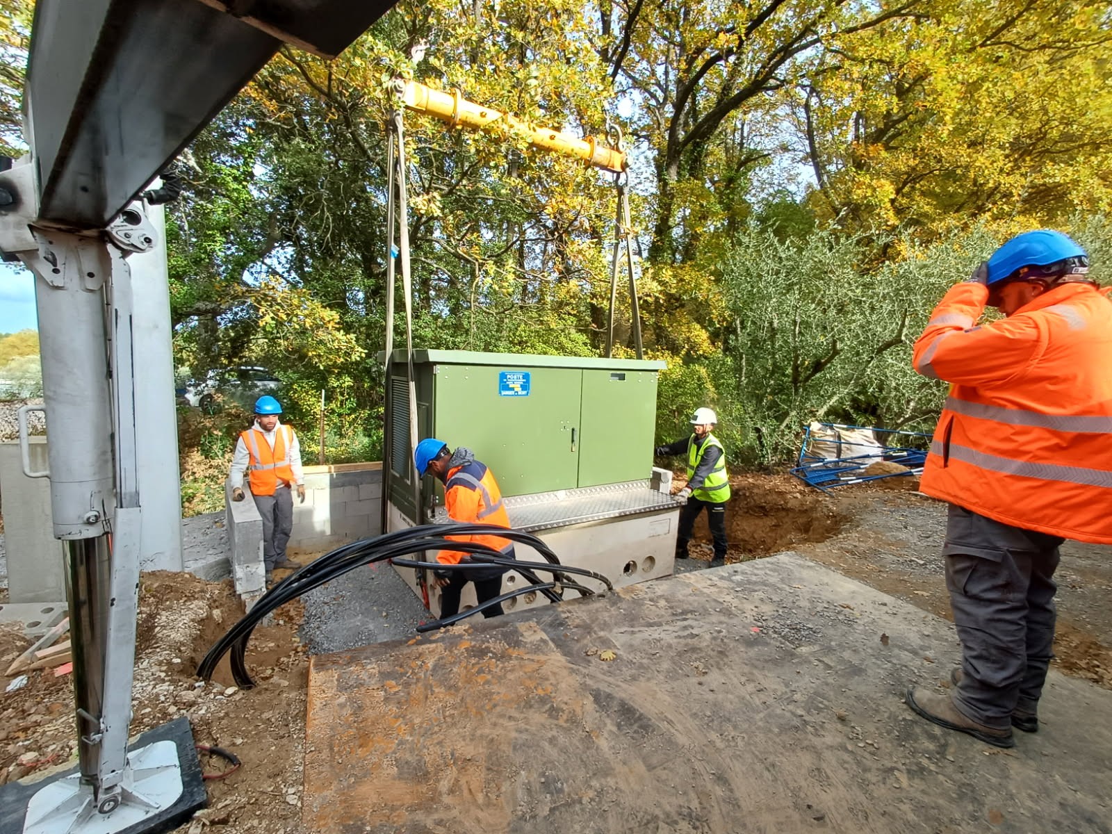 Les équipes d’Enedis étaient à l’œuvre aujourd’hui au bas du chemin des Bonnets pour mettre en place le transformateur qui permet de poursuivre le phasage électrique de ce secteur.