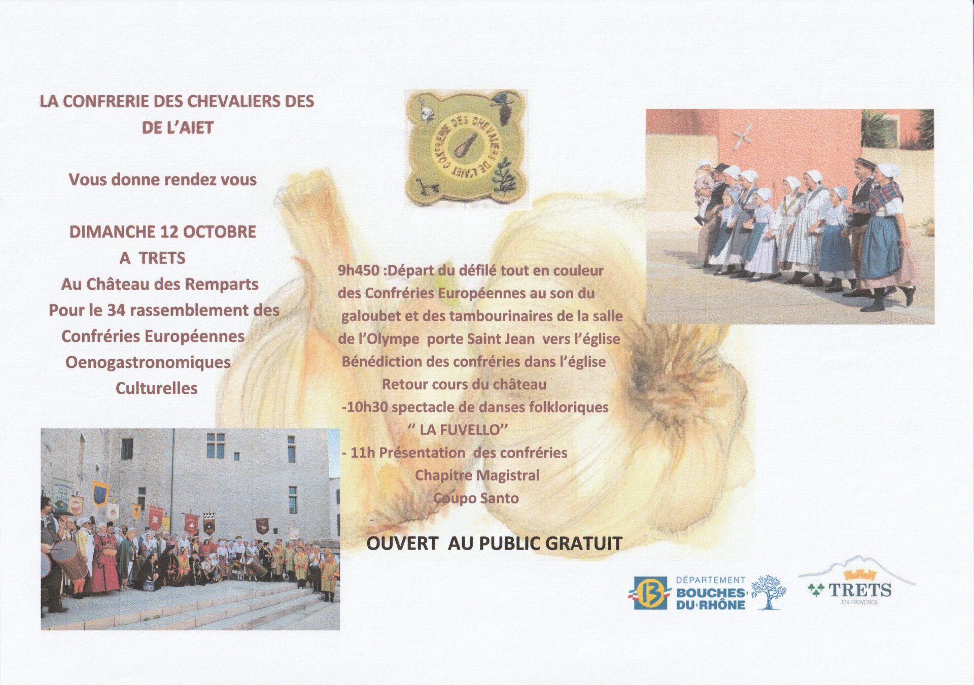 Le lendemain, dimanche 12 octobre à 10h, elle vous invite au rassemblement des confréries amies dans la Cour du Château des Remparts avec spectacle de danses folklorique et chapitre magistral.