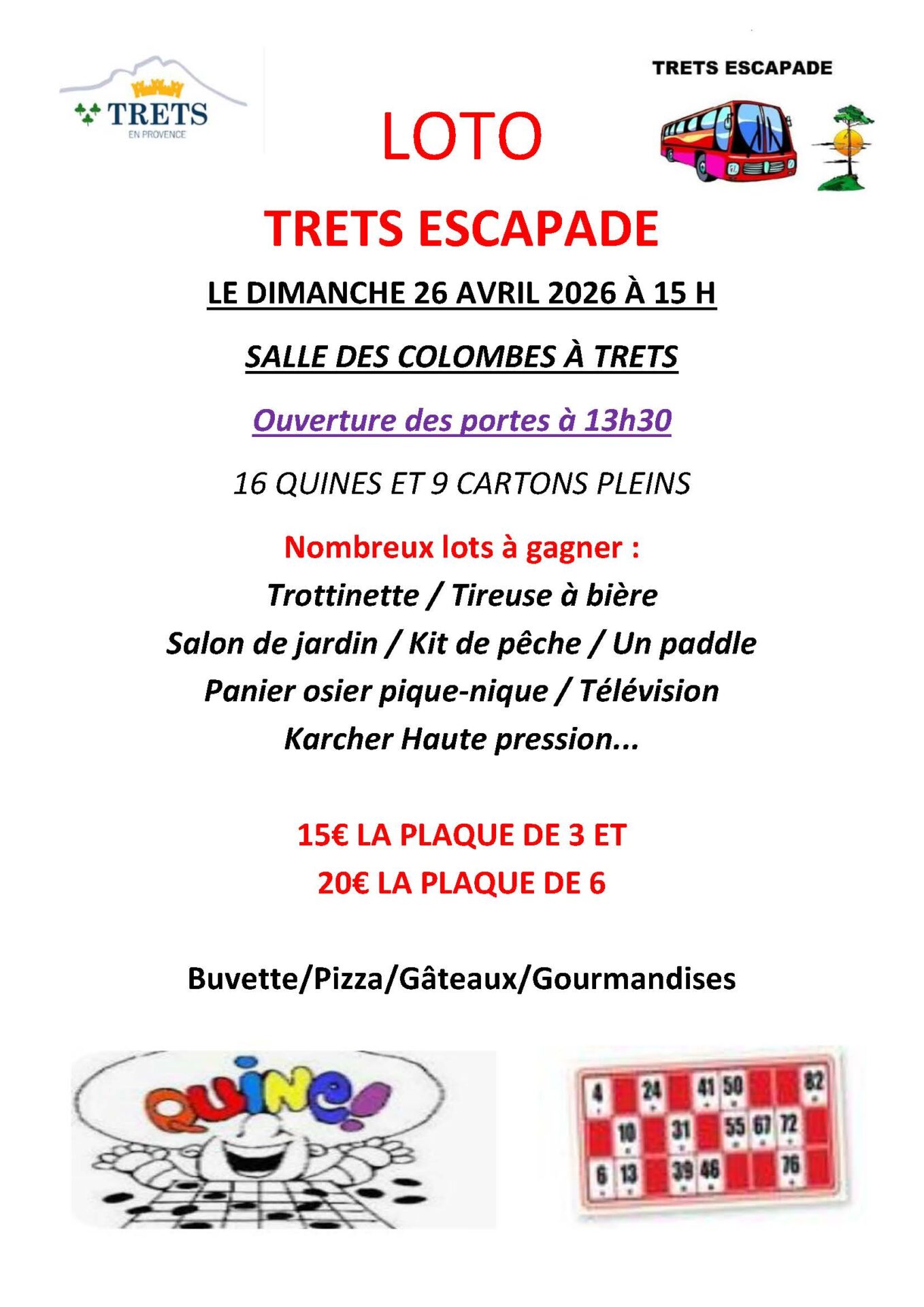Thème : LOTO Public : Tout Public Date : Le 26 avril 2026 Lieu : Salle des Colombes Horaires : 15h L’association Trets Escapade organise son loto dimanche 26 avril à 15h00 à la Salle des Colombes ! Ouverture des portes à 13h30Nombreux lots à gagnerBuvette sur place