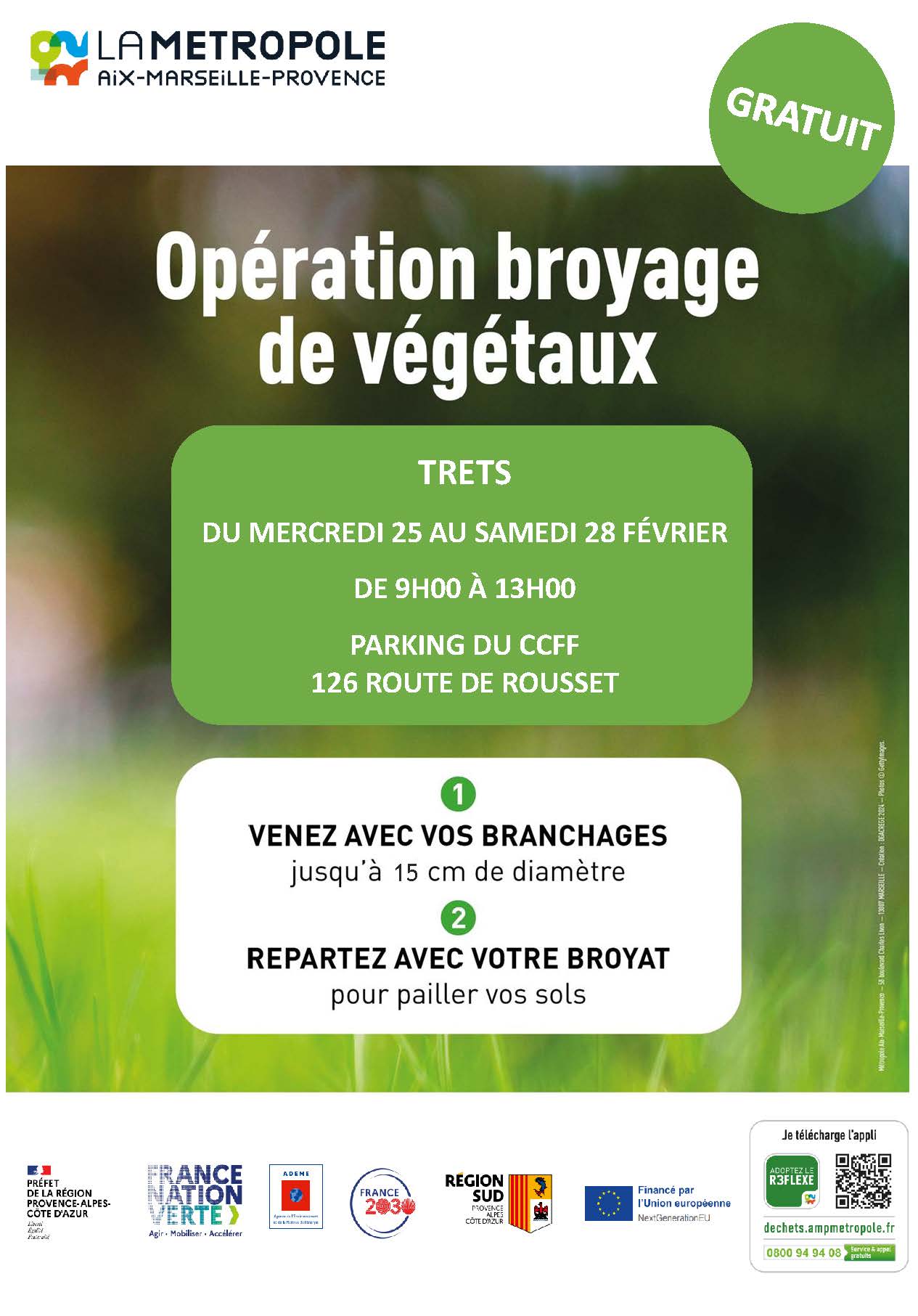 La Métropole Aix-Marseille-Provence vous invite à participer à une opération de broyage de végétaux du mercredi 25 au samedi 28 février 2026, sur le terrain du CCFF, 126 route de Rousset.